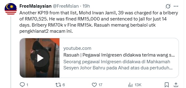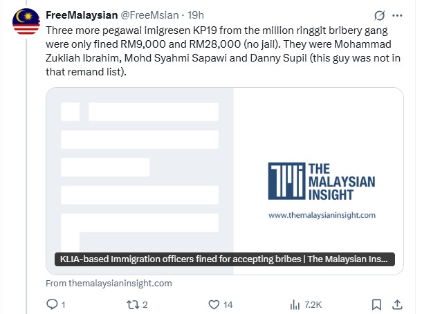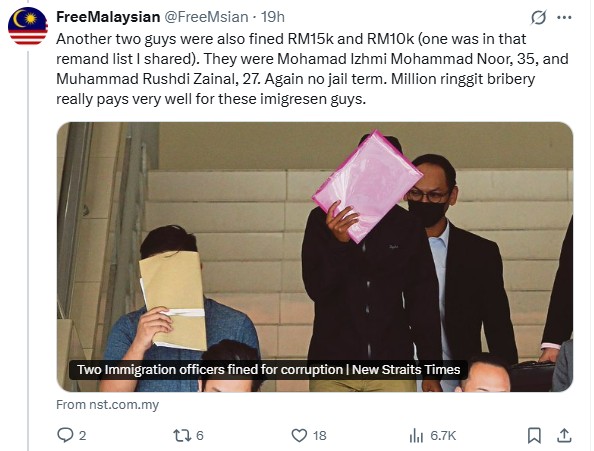 “They were Mohamad Izhmi Mohammad Noor, 35, and Muhammad Rushdi Zainal, 27. Again no jail term. Million-ringgit bribery really pays very well for these immigration guys,” lamented the poster.