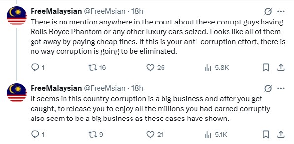 “Looks like all of them got away by paying cheap fines. If this is your anti-corruption effort, there is no way corruption is going to be eliminated,” fumed FreeMalaysian.