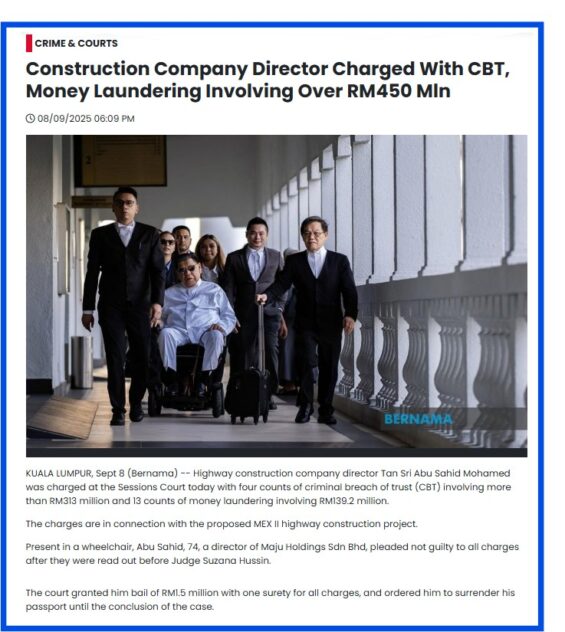 The latest involves Maju Holdings Sdn Bhd director Tan Sri Abu Sahid Mohamed, 74, who was charged in the Kuala Lumpur Sessions Court yesterday (Sept 8) with four counts of criminal breach of trust (CBT) involving RM313 mil and 13 counts of money laundering totalling RM139 mil.
