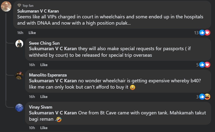 They mockingly concluded that for RM20,000, there is a three-night pre-court appearance package which includes wheelchair, attendant and pre-approved press release, plus a photo of the suitably ill-looking VVIP patient in the ward.