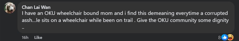 This trend was spotted by lawyer and human rights activist Siti Kasim who remarked on Facebook (FB) quite sarcastically with a one-liner – “Of course he will be on a wheelchair … ”.