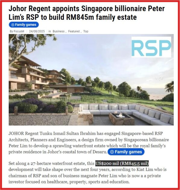 Recall that the Johor Regent had last month engaged Singapore-based RSP Architects, Planners and Engineers, a design firm owned by Singaporean billionaire Peter Lim, to develop a US$200 mil (RM845.5 mil) sprawling waterfront estate which will be the royal family’s private residence in Johor’s coastal town of Desaru.