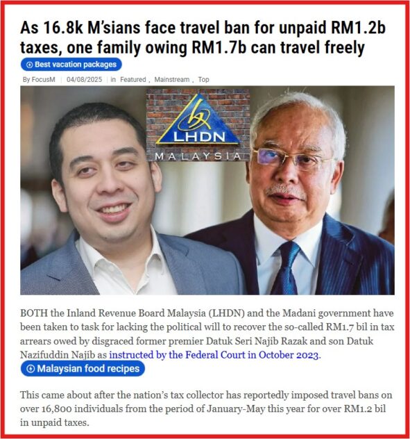In early August, aghast Malaysians snubbed LHDN and the Madani government for lacking the political will to recover the so-called RM1.7 bil in tax arrears owed by the 1MDB scandal chief protagonist and son Datuk Nazifuddin Najib as instructed by the Federal Court in October 2023.