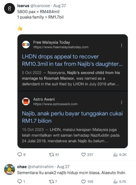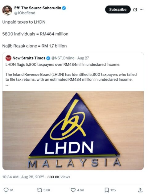 “5,800 individuals = RM484 mil. Najib Razak alone = RM 1.7 bil,” revealed Effi The Source Saharudin (@1Obefiend).