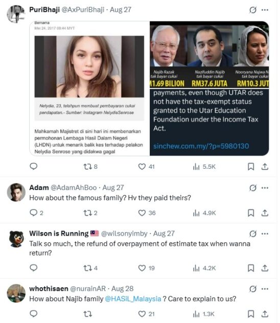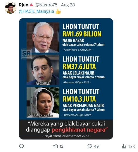 IT seems that every time the Inland Revenue Board (LHDN) shares updates on its anti-tax evasion drive, Malaysians are quick to remind the nation’s tax collector that it should first go after disgraced former premier Datuk Seri Najib Razak and family who collectively owe in excess of RM1.7 bil.