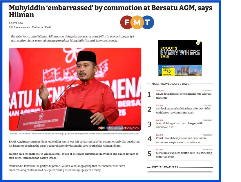 As per the admission of the party’s Youth chief Hilman Idham, Muhyiddin was left embarrassed with the commotion incident as it has tarnished Bersatu’s image (this has led to detractors labelling the party as “Berpecah” [literally, “split”]).