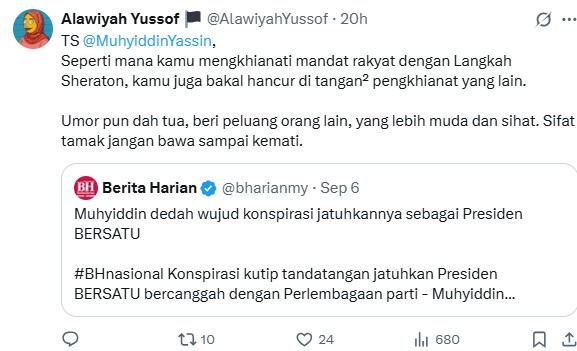 In a subsequent post, the PKR-inclined poster further reminded Muhyiddin that karma would eventually catch up with him after the 78-year-old Pagoh MP alleged that there has been a conspiracy to oust him as Bersatu president.