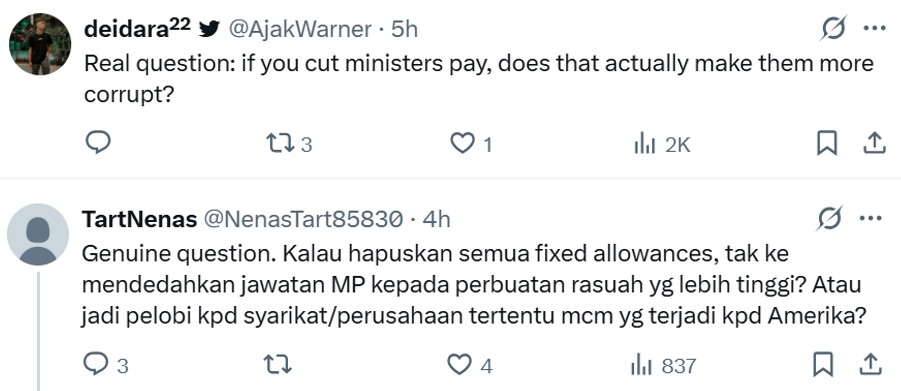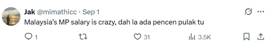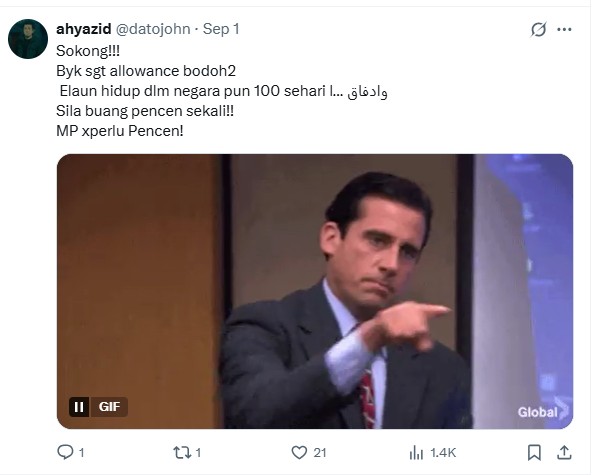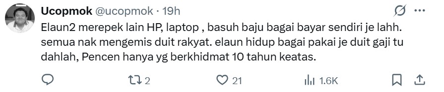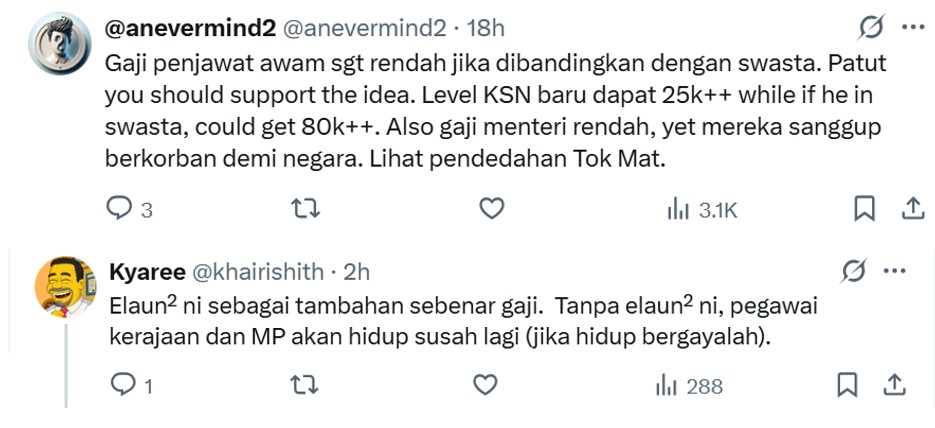 The poster was reacting to a list of allowances published in Malaysiakini and BFMNews with the post eliciting plenty of responses as evident from it having generated 218.2K views at the time of writing.