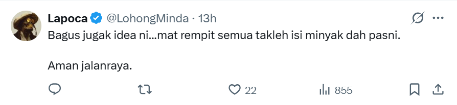“This idea is good too. All the Mat Rempits will not be able to fuel up after this. The road is peaceful,” said @LohongMinda while @bayusegar wondered if they got a grade D, they can only fill up with diesel?