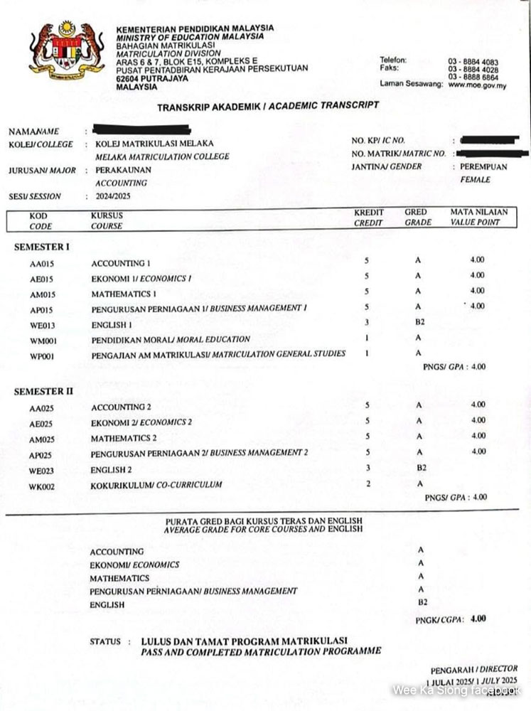 “Lee has obtained perfect results. However, not only did she not get her preferred course in law, but she was also not allowed to make any appeal since the Higher Education Ministry offered her fourth choice, which is accounting. Looks like she can only wait for a miracle to happen," Wee said.
