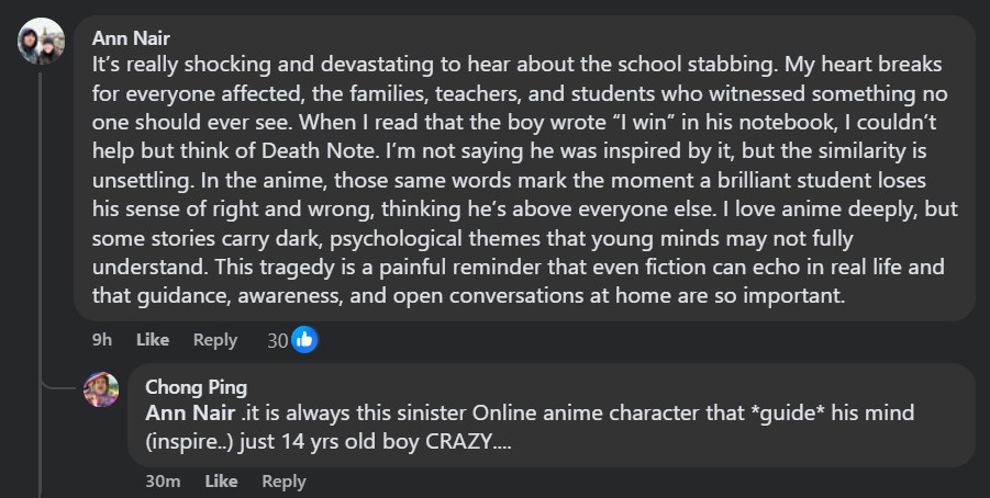 “When I read that the boy wrote “I win” in his notebook, I couldn’t help but think of Death Note. I’m not saying he was inspired by it but the similarity is unsettling,” reacted senior technology consultant Ann Nair to a post by Heetam Coffee founder/director Irene Halimi.