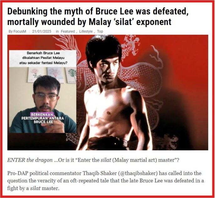 Couple this with urban legends such as the one claiming that famed martial arts exponent, Bruce Lee, was mortally wounded from a blow by a local silat warrior, the narrative is to portray one of racial dominion.