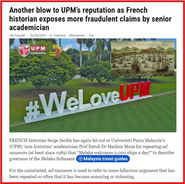 There were also attempts by senior academics at Universiti Putra Malaysia (UPM) to falsely claim that over 2,000 ships sailed to Melaka daily during the glory days of the Melaka sultanate.