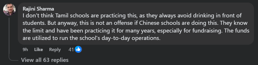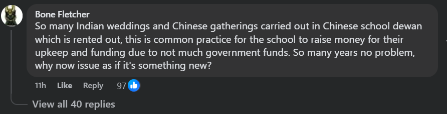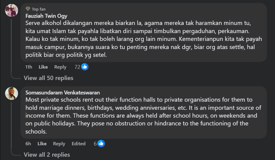 This is considering that it has been a customary practice to allow the serving of alcohol inside school halls funded exclusively by the Chinese community that are rented to house events like weddings, temple dinners or entertainment outside school hours with no pupil involvement since Merdeka in 1957.