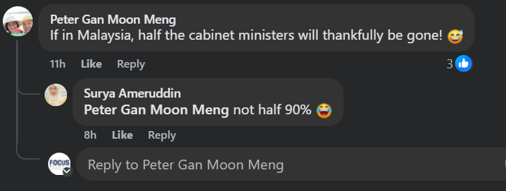 “If in Malaysia, half the cabinet ministers will thankfully be gone! ” by Klang-nite Peter Gan Moon Meng seemed to sum up the sentiment on behalf of ‘Boleh-landers” with Surya Ameruddin observed that “it’s not not half (but) 90%
