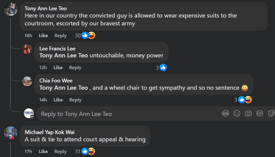 Bintulu guy Tony Ann Lee Teo could be insinuating court scene which starred disgraced former premier Datuk Seri Najib Razak with his response: “Here in our country the convicted guy is allowed to wear expensive suits to the courtroom, escorted by our bravest army.”