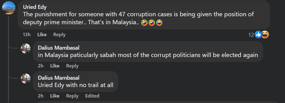 One ‘profile-less’ commenter Uried Edy must be referencing UMNO president Datuk Seri Ahmad Zahid Hamidi with this remark” “The punishment for someone with 47 corruption cases is being given the position of Deputy Prime Minister. That’s in Malaysia. ”
