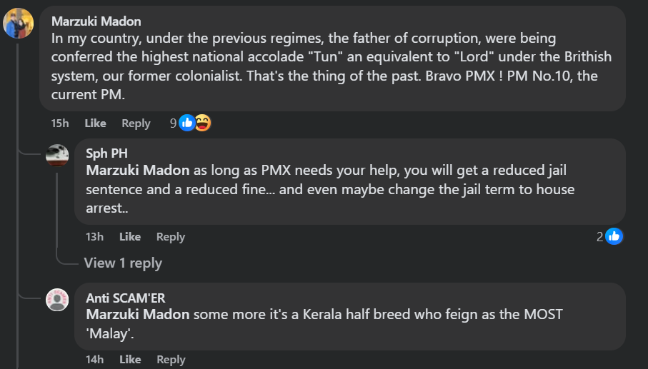 A seemingly pro-Madani accountant Marzuki Madon was astonished at the fact that “the father of corruption from the previous regime was conferred the highest national accolade ‘Tun’ which is an equivalent to ‘Lord’ under the British system, our former colonialist”.