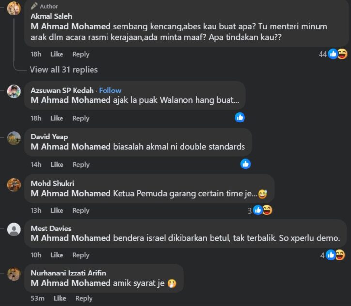 Another teased the Melaka Rural Development, Agriculture and Food Security state EXCO that “a demo is unnecessary as the Israeli flag is not flown upside down” as the latter tried to deflect the issue by asking if “the minister who drank alcohol during official government function has apologised for his action”.