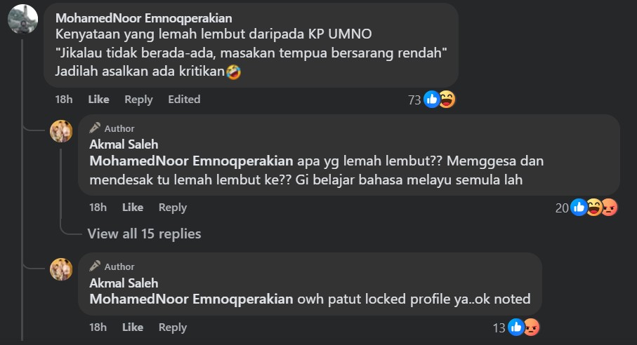 The Russian-trained medical doctor was also seemingly agitated as he threatened “to lock the profile” of one commenter who described his reaction as “too gentle coming from the UMNO Youth chief” and that the remarks was made “so long as there is some form of criticism”.
