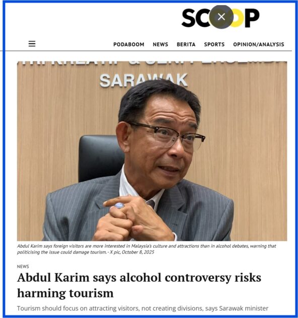 Even Parti Pesaka Bumiputera Bersatu (PBB) information chief Datuk Abdul Karim Rahman has ticked off the gross politicisation on the serving of alcohol at government events – particularly by rightist PAS and UMNO – by warning that the controversy risks harming Malaysia’s tourism industry.