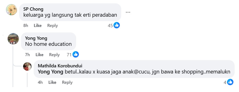 Many of Siti Kasim’s followers on Facebook concurred with one observer simply stating it was “embarrassing” that some parents exercise no control or supervision over their kids when in a public space such as a shopping complex.