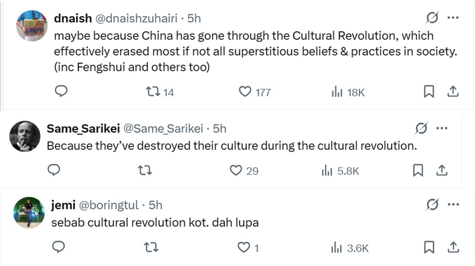 In contrast, the Chinese community in Malaysia could still hold on to their beliefs and culture as they migrated before the upheaval of the Cultural Revolution (1966-1976). One commenter even shared a YouTube link explaining precisely why this phenomenon exists.