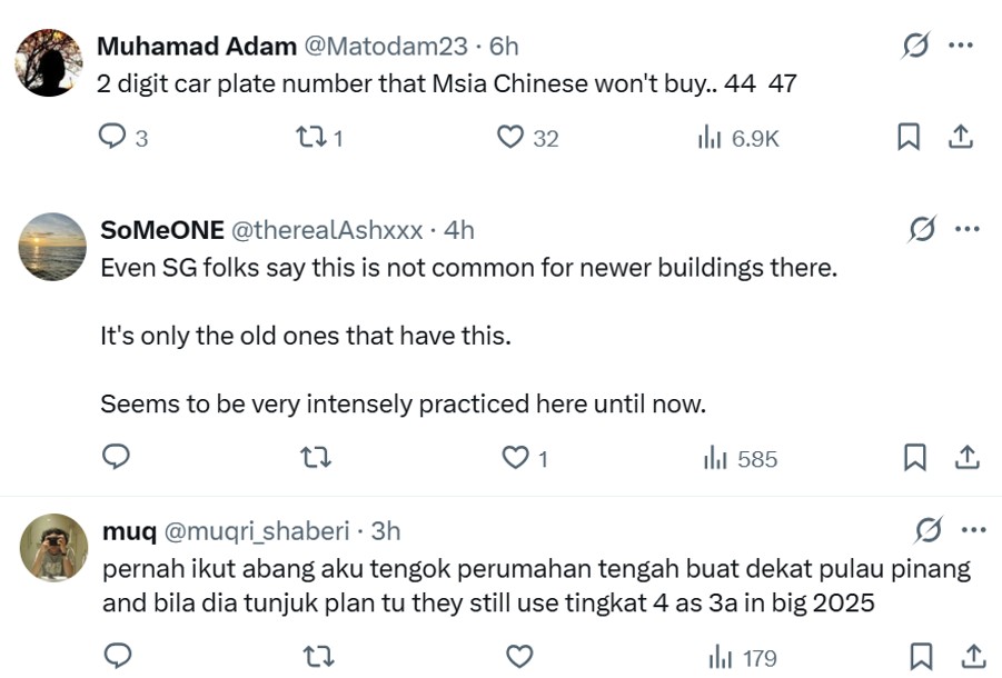 However, it was observed that that despite it being 2025, this practice of removing the digit “4” from project names, home addresses, lifts and car registration plates remain strong in Malaysia.