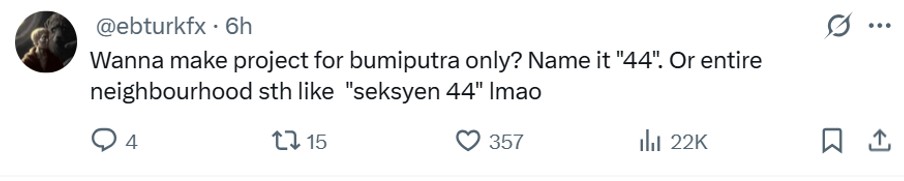 One commenter joked that if a developer wants a neighbourhood to have zero Chinese residents, it can name it ‘44’ or call the area ‘Section 44’. (Editor’s note: This though ignores that there is a Section 4 in Petaling Jaya which boasts many Chinese residents.)