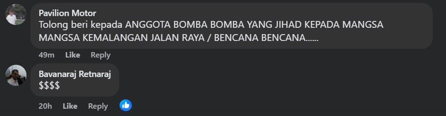 “Tolong beri kepada ANGGOTA BOMBA BOMBA YANG JIHAD KEPADA MANGSA MANGSA KEMALANGAN JALAN RAYA / BENCANA BENCANA …” (Literally, “Please give to the FIREFIGHTERS WHO ARE JIHADISTS TO THE VICTIMS OF ROAD ACCIDENT/DISASTERS …”)