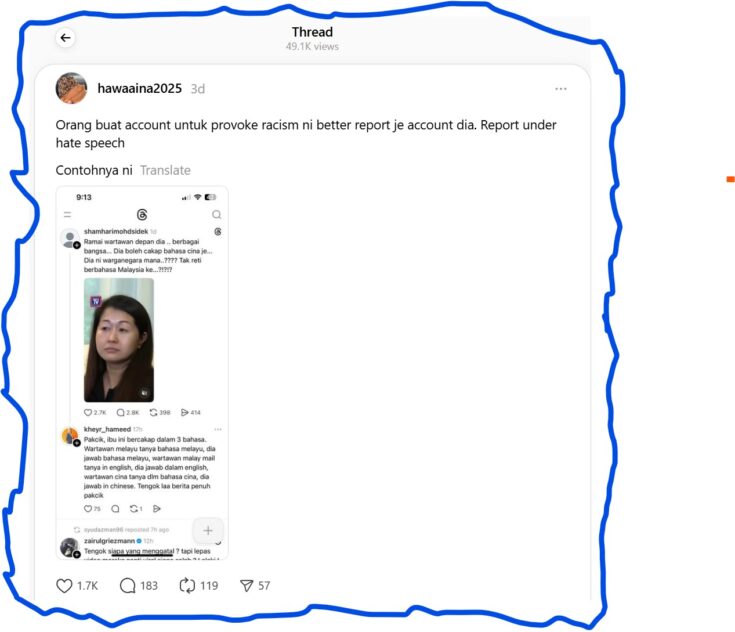 The Rakyat Post cited Threads user shamharimohdsidek questioning: “Many reporters in front of her … various races … She can only speak Chinese … What nationality is she? Doesn’t she know how to speak Bahasa Malaysia (BM)?”
