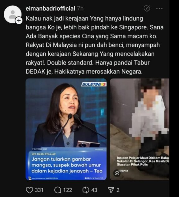 shamharimohdsidek’s insensitive remarks were exposed by Threads user hawaaina2025 who cited the comment as an example of accounts that are created to provoke racism, hence “should be reported under hate speech”.