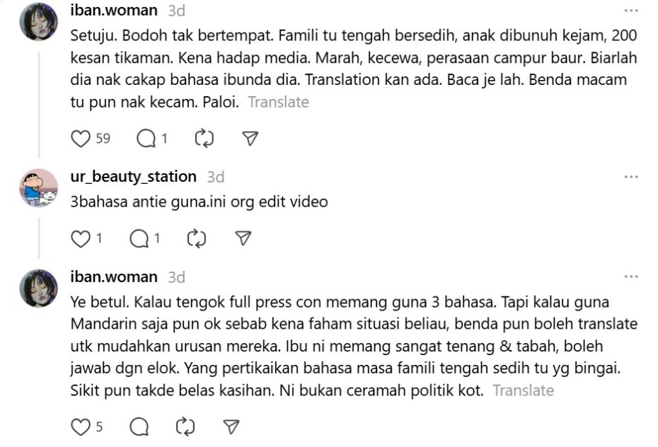 As rightly pointed out by an indigenous artist iban.woman, the late Shing Xuen’s mum should be allowed to address the media in her mother tongue if so desired as “she was fighting anger, disappointment and mixed feelings”.