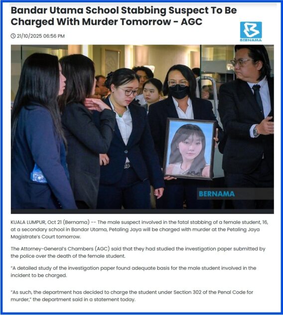 Moving forward, the 14-year-old suspect in Shing Xuen’s murder will be charged for murder under Section 302 of the Penal Code today (Oct 22), according to the Attorney General’s Chambers.