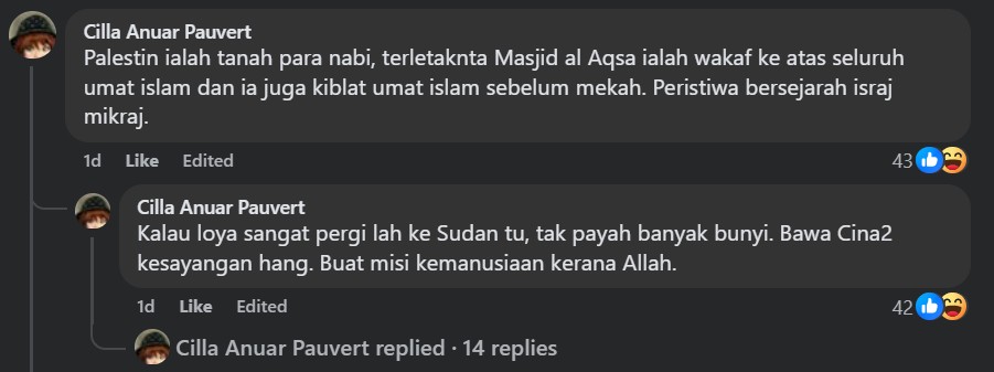 She was referencing a Facebook post by one Muhammad Nasri Bin Azhar who among others claimed that the well-to-do Malays are ignoring the plight of Muslims who are suffering in Darfur (Western Sudan region) given “without Israeli presence in Darfur, the emotional game becomes uninteresting”.