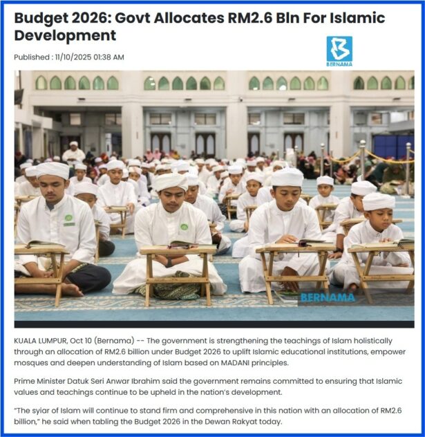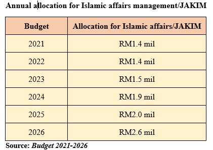 THE channelling of RM2.6 bil under Budget 2026 to ensure Islamic propagation remains all-encompassing and upright is by far the highest allocation set aside for the management of Islamic affairs in Malaysia.