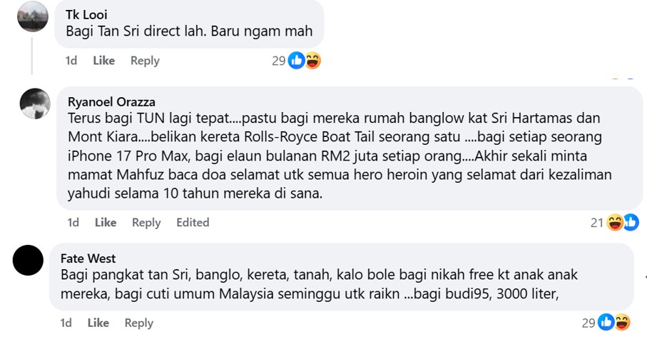 The highest possible honorary titles in the likes of “Tan Sri” and “Tun” were also mentioned to troll Mahfuz who is currently the Farmers’ Organisation Authority (FOA) chairman (since May 2023) as well as many other lucrative rewards in the likes of “one Rolls-Roye Boat Tail each” or even “a RM2 mil monthly allowance each”.