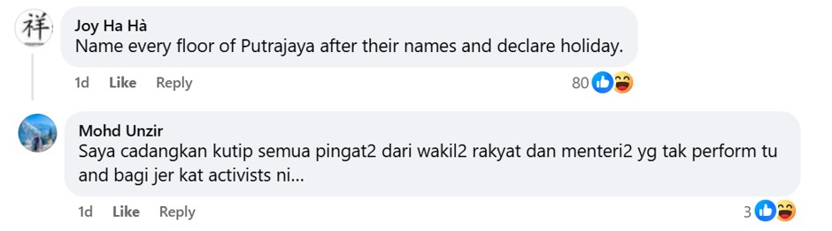 Other novel suggestions included re-naming every floor of official government building in Putrajaya in their honour while another commenter suggested transferring award medals from “non-performing MPs and ministers” to these fearless GSF activists.