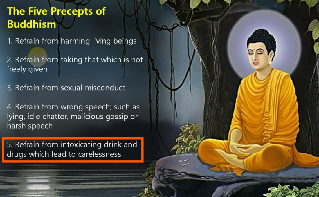 - In Buddhism, the consumption of intoxicating drinks is included in the Five Precepts – that is to avoid substances that cause loss of consciousness and corrupt the mind.