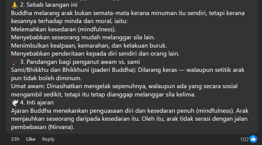Probably to showcase the universality of alcohol rejection by major faiths of the world instead of confining it to only Islam, commenter Tom Haqimie reasoned that even Buddhism abhors the intoxicating effect of alcohol to the extent hat this was inscribed in the fifth of its Five Precepts a.k.a. Pancasila.