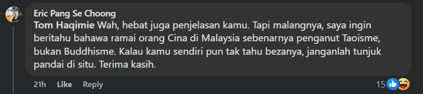 This was when one Eric Pang Se Choong claimed that the commenter has erred for majority of Chinese Malaysians are fundamentally Taoists, hence ticked him off for his flawed assumption.