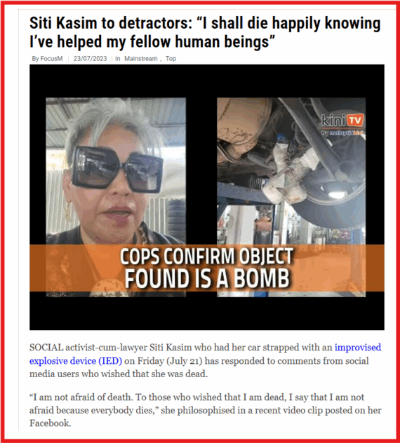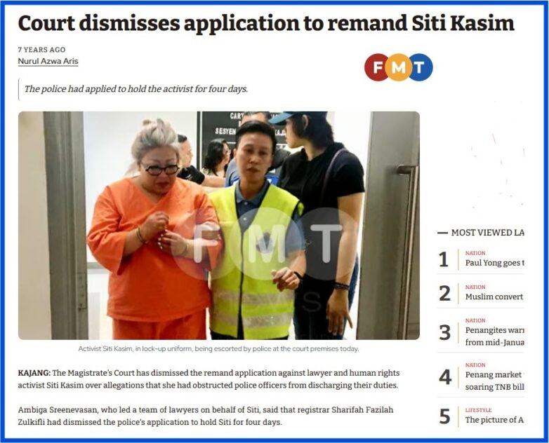 Editor’s Note: The Kajang Magistrate’s Court eventually dismissed the remand application to hold Siti Kasim for four days over allegations that she had obstructed police officers from discharging their duties.