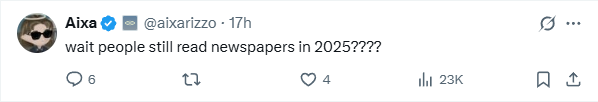 Then there was netizen @aixarizzo raising a vital question, “Wait, people still read newspapers in 2025?”