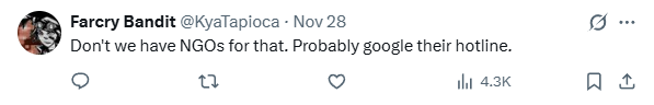 Then there was @KyaTapioca suggesting that people contact an NGO to help with the rescue.