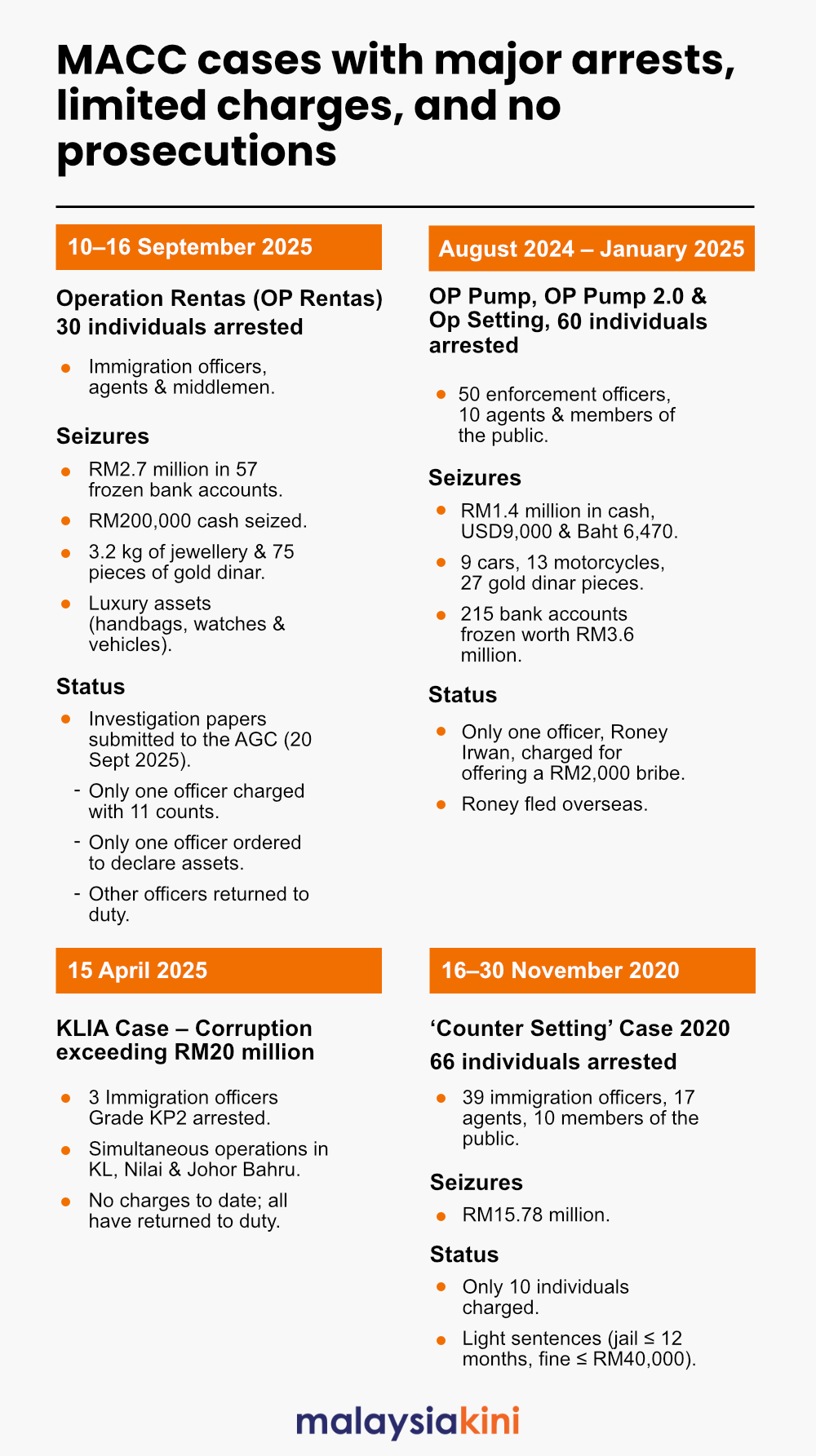 The chart below shows that more than 100 immigration officers have been arrested by MACC since 2020 through several major operations, but fewer than 10 were charged in court, while more than 90 percent returned to duty without serious action taken.