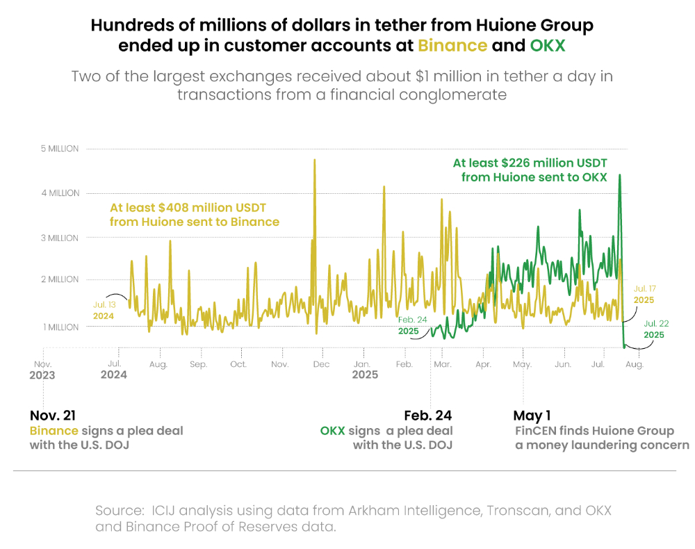 ICIJ examined tens of thousands of transactions worth hundreds of millions of dollars that Huione sent to customer deposit addresses at Binance and OKX. Over one year, Huione funnelled an average of US$1 million worth of tether per day to customer accounts at Binance, an ICIJ analysis found.