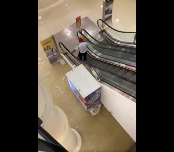 Social media platforms were flooded with videos showing streams of water rushing across the lower levels of the mall. Shoppers could be seen walking through ankle- to knee-deep water as staff scrambled to move items away from entrances.