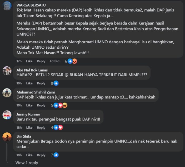 However, little did he know that amid calls for “mass police report to be lodged against Kok” or “sue DAP”, he is shooting himself on the foot for his rebuttal of Kok’s statement has in fact provoked more hatred towards UMNO “which has to cling on to DAP for its survival”.