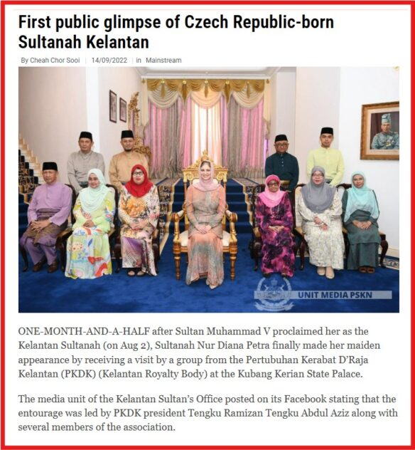 In August 2022 or three years after his bitter divorce, Sultan Muhammad V has apparently made his second wife, Czech Republic-born Nur Diana Petra Abdullah a.k.a. Yana Yakoubka, the Kelantan Sultanah.