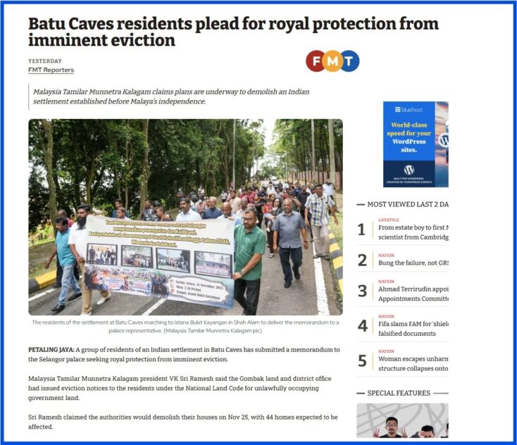 Apparently, the Selangor Menteri Besar’s office has refused to entertain the complaints lodged by those in the Batu Caves Indian settlement. Lately, the residents have appealed for the intervention of the Selangor ruler